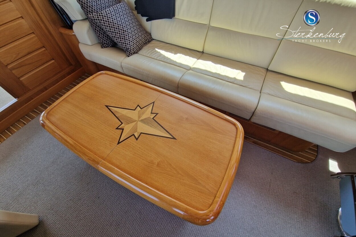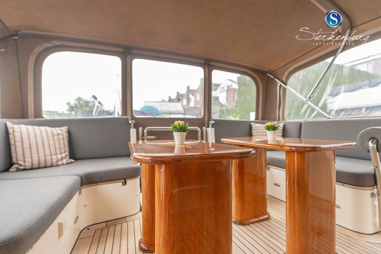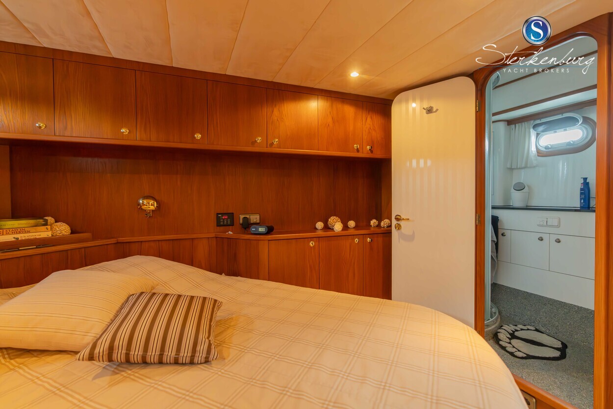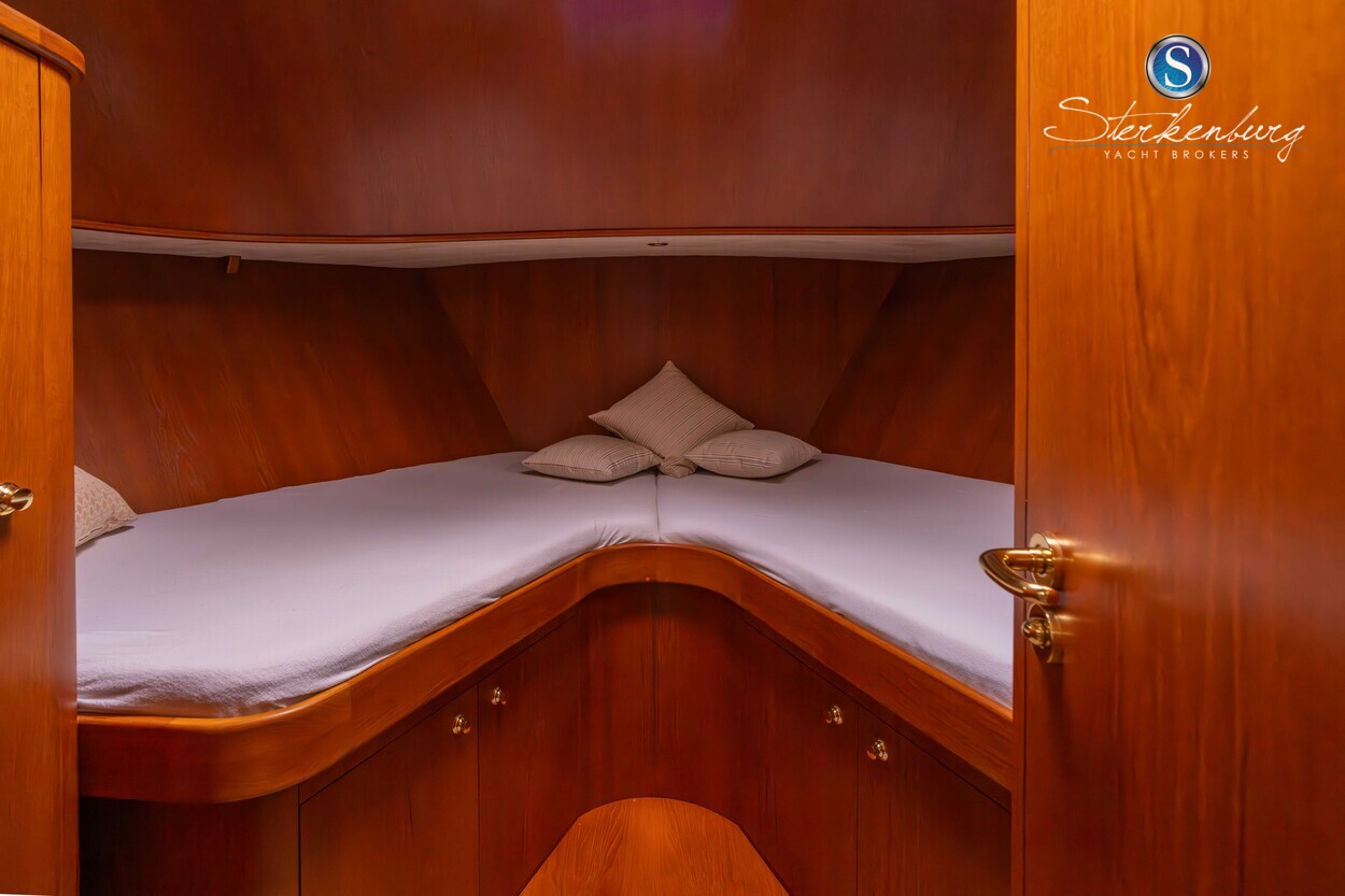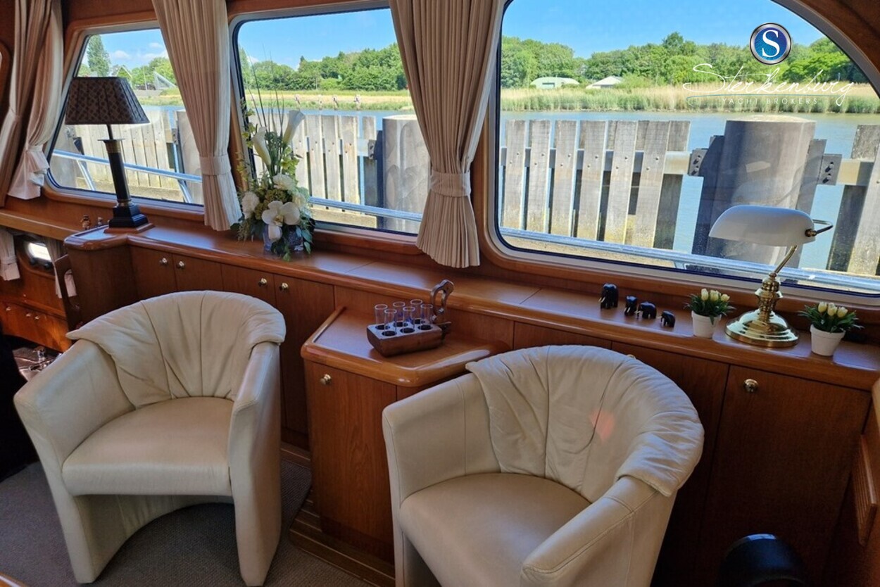 Deze prachtige rondspant gejoggelde Linden 1500 OK heeft een twee hutten indeling met een riante eigenaarshut midscheeps. Beide hutten zijn voorzien van een eigen badkamers met toilet en douchecabine. Salon en achterdek zijn gelijkvloers aan elkaar verbonden. De kombuis en salonzit zijn benedendeks en bieden veel comfort voor alle opvarenden. Dit jacht is uitgevoerd met hydraulische vin stabilisatoren, waardoor het ook varen in slechtere weersomstandigheden geen probleem is. Ze is zeer compleet uitgerust.