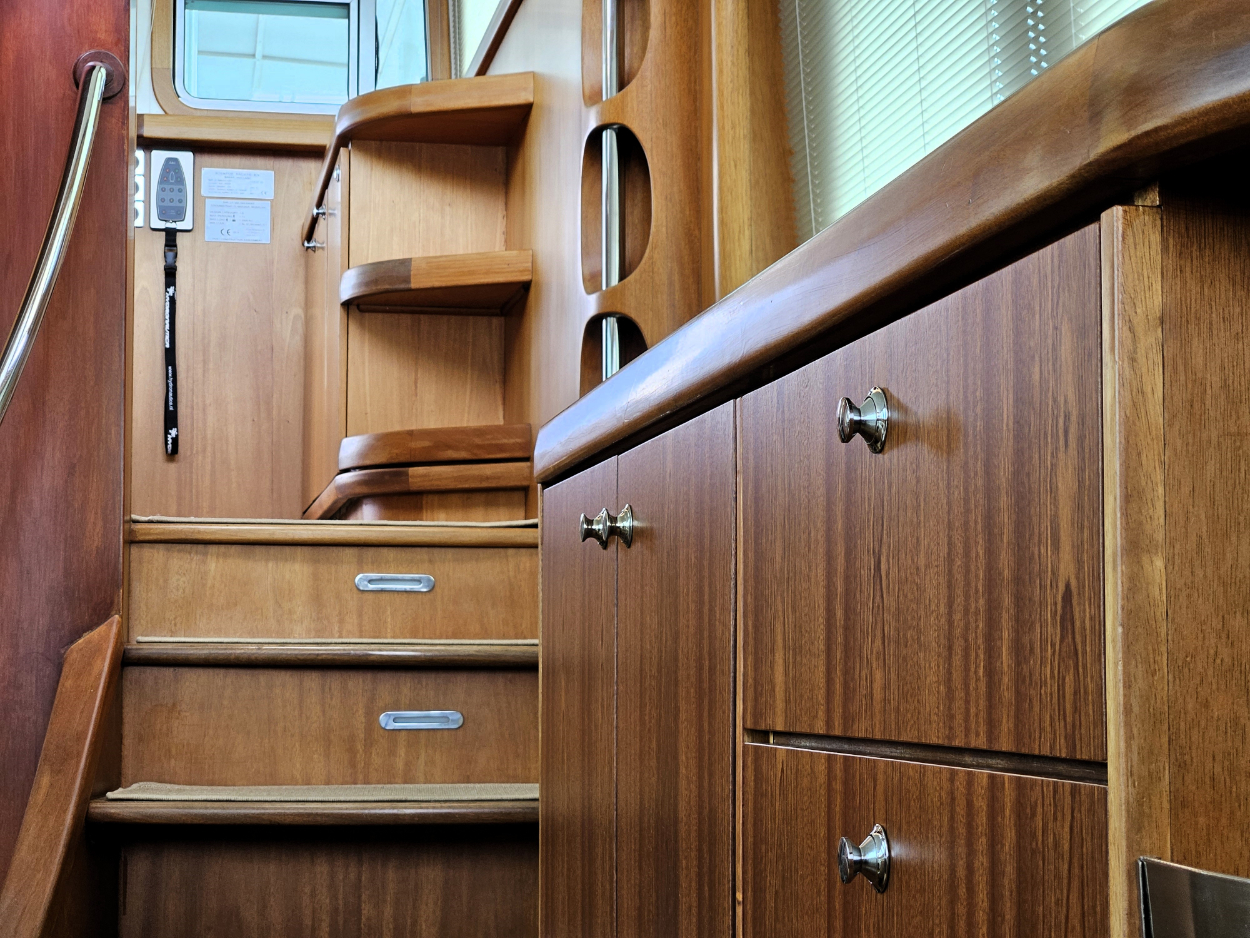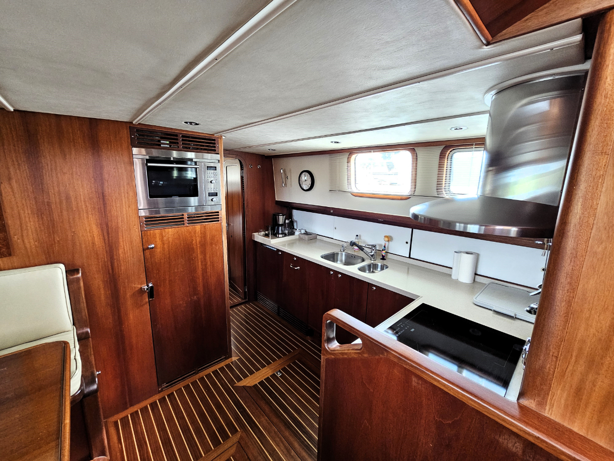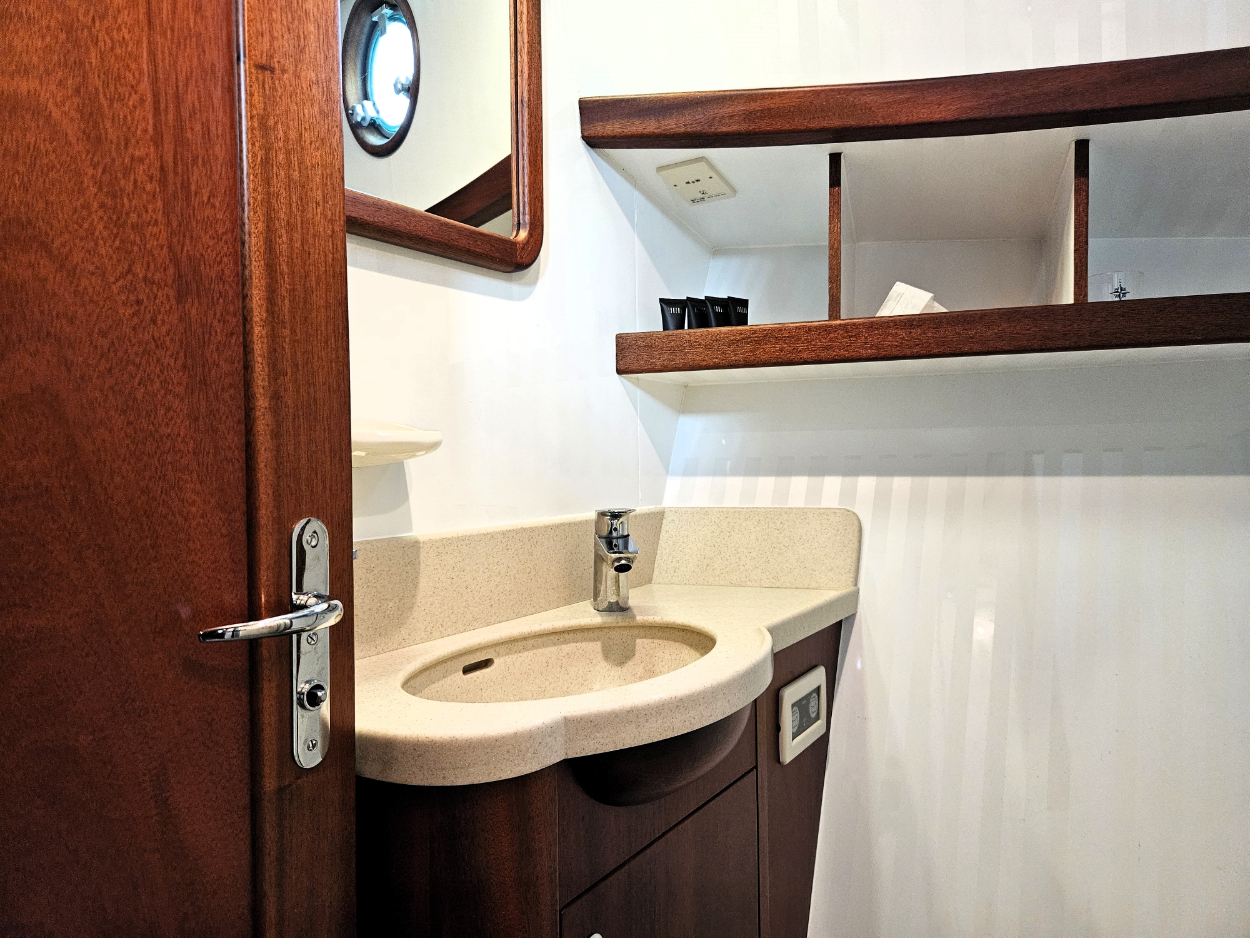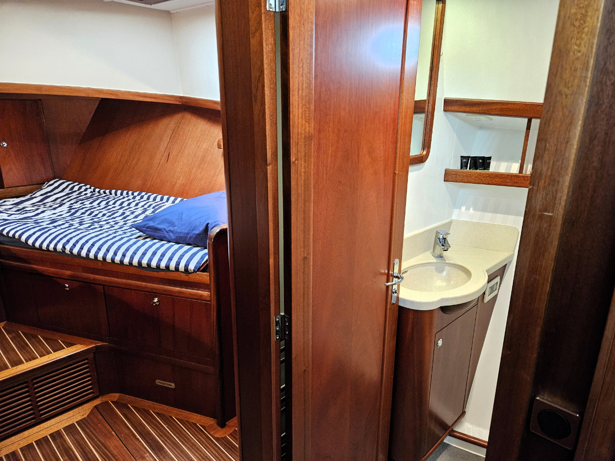 Aan boord vindt u twee ruime hutten met elk een eigen badkamer, een stijlvol teakhouten interieur en een uitstekend uitgeruste kombuis met onder andere een inductiekookplaat, oven, grote koelkast en vriezer, plus een Miele was-droogcombinatie. Dankzij centrale verwarming, airconditioning, dubbel glas en een eigen internetsysteem is het comfort vergelijkbaar met dat van een luxe appartement. Ook buiten is gedacht aan gemak, met kraan voor de bijboot, ruim zwemplatform en een teak achterdek met fijne zitgelegenheid.
