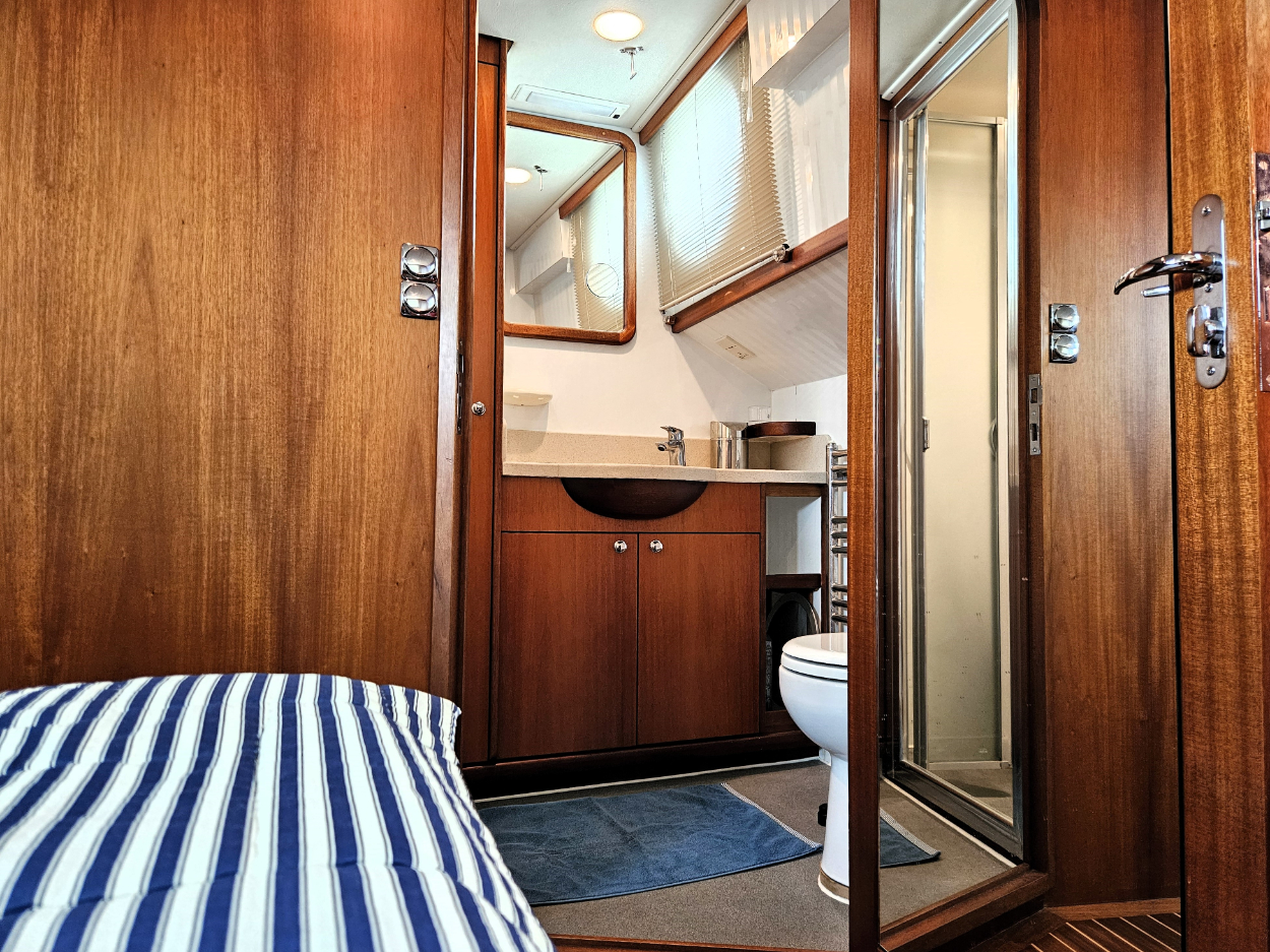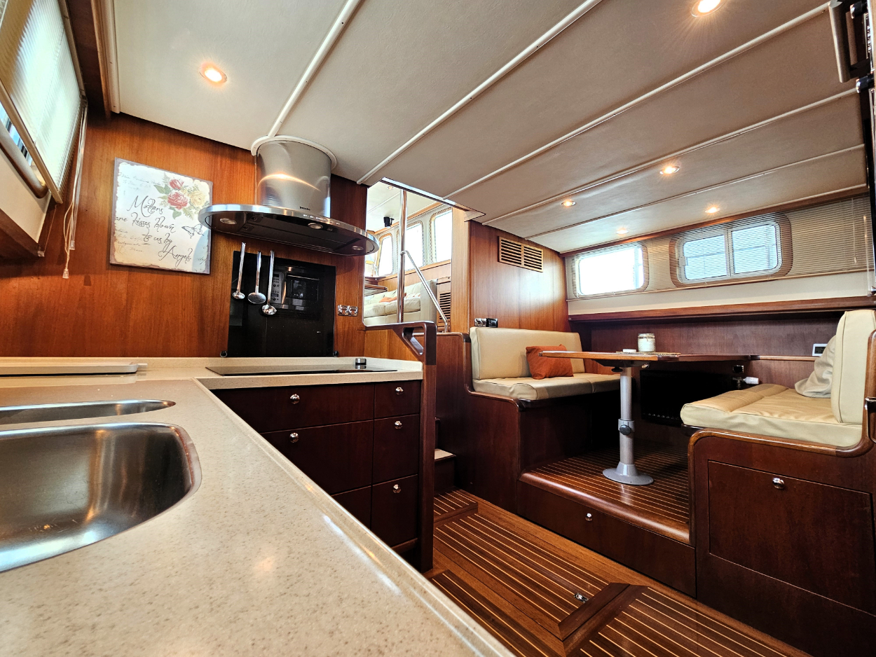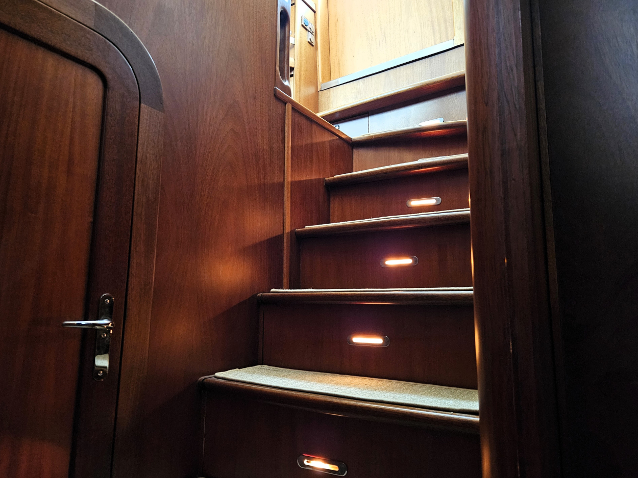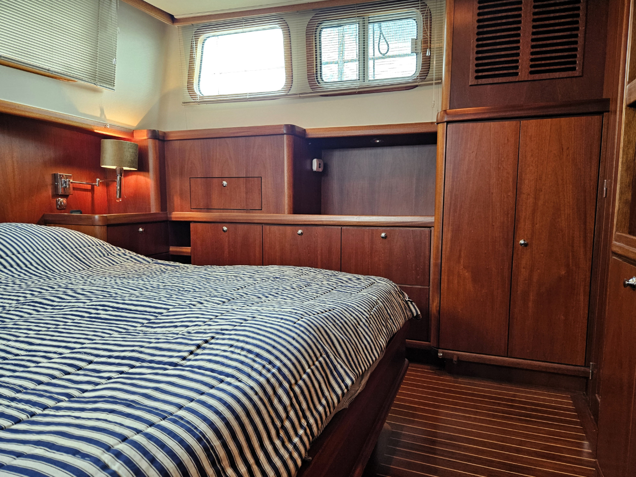 Aan boord vindt u twee ruime hutten met elk een eigen badkamer, een stijlvol teakhouten interieur en een uitstekend uitgeruste kombuis met onder andere een inductiekookplaat, oven, grote koelkast en vriezer, plus een Miele was-droogcombinatie. Dankzij centrale verwarming, airconditioning, dubbel glas en een eigen internetsysteem is het comfort vergelijkbaar met dat van een luxe appartement. Ook buiten is gedacht aan gemak, met kraan voor de bijboot, ruim zwemplatform en een teak achterdek met fijne zitgelegenheid.