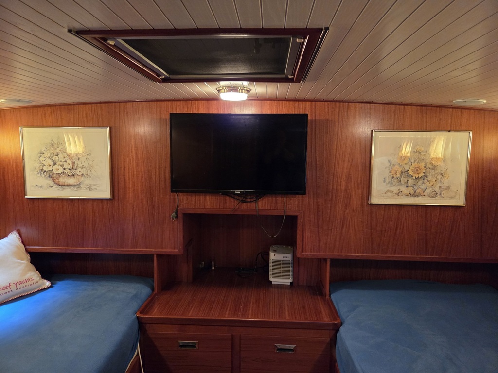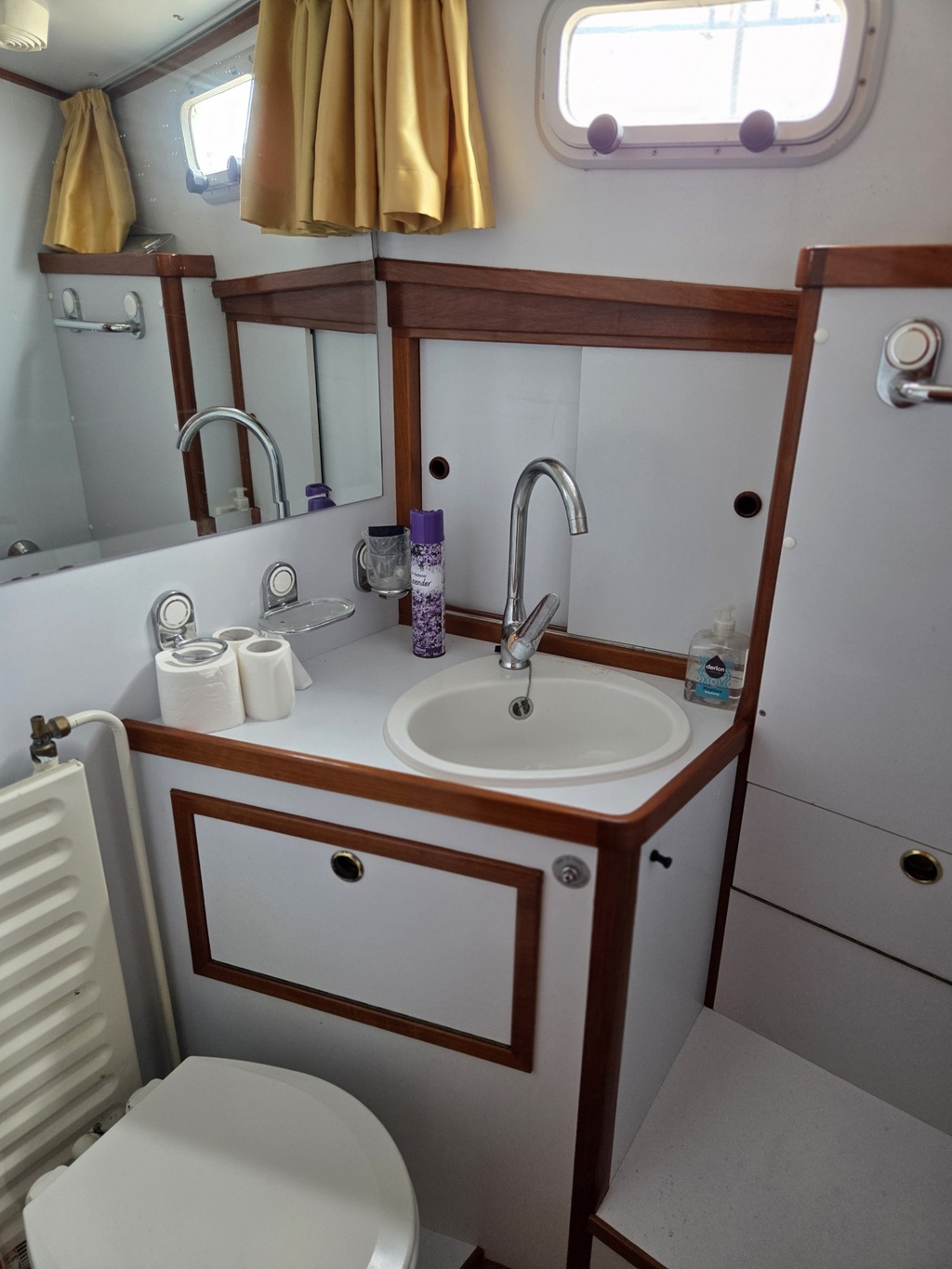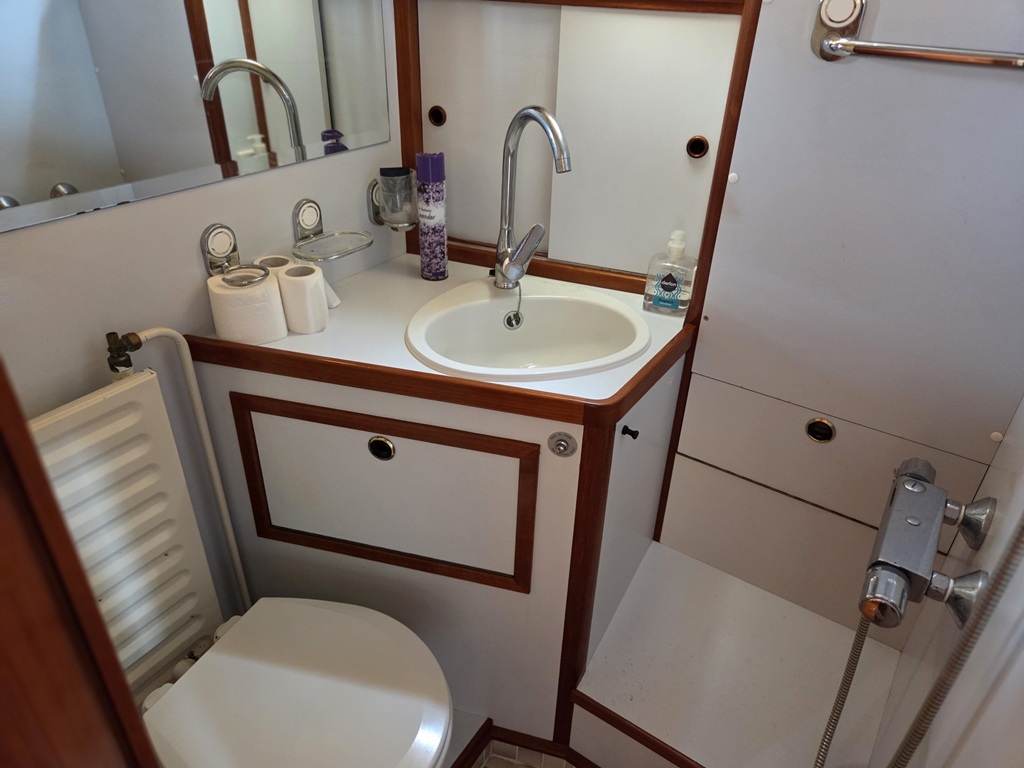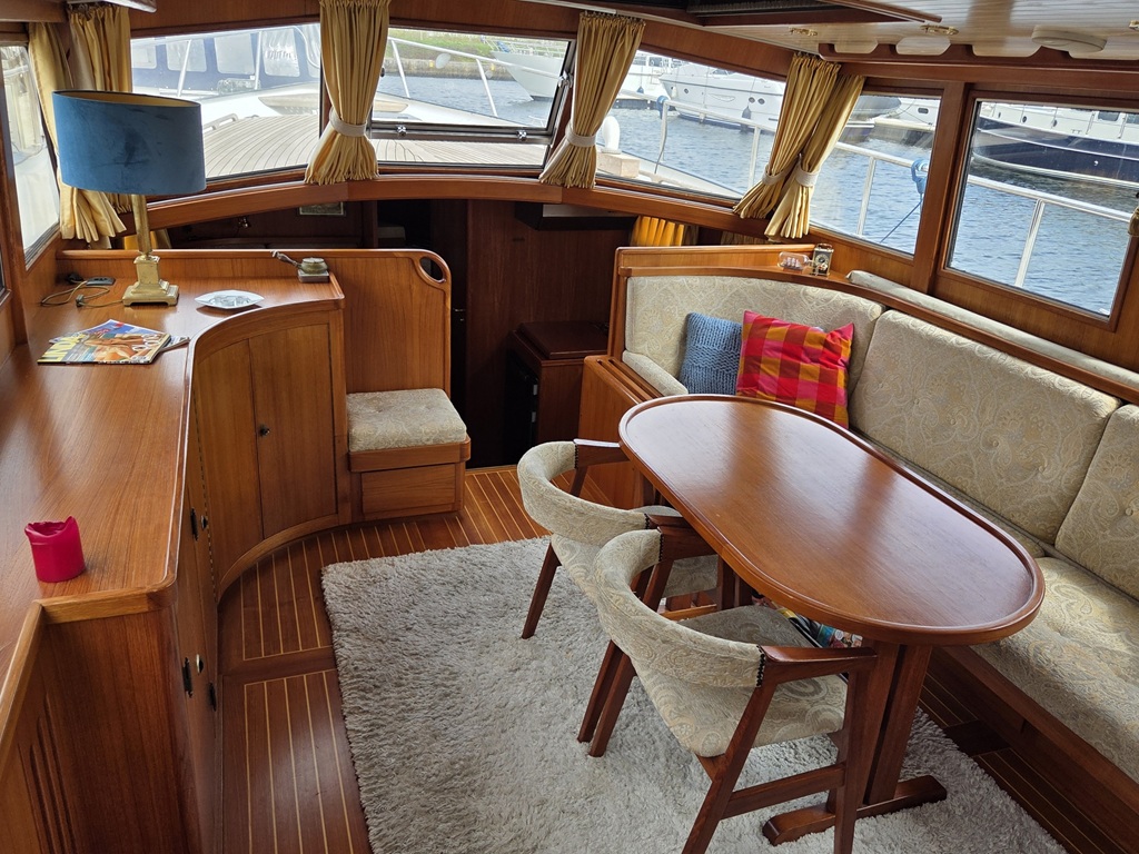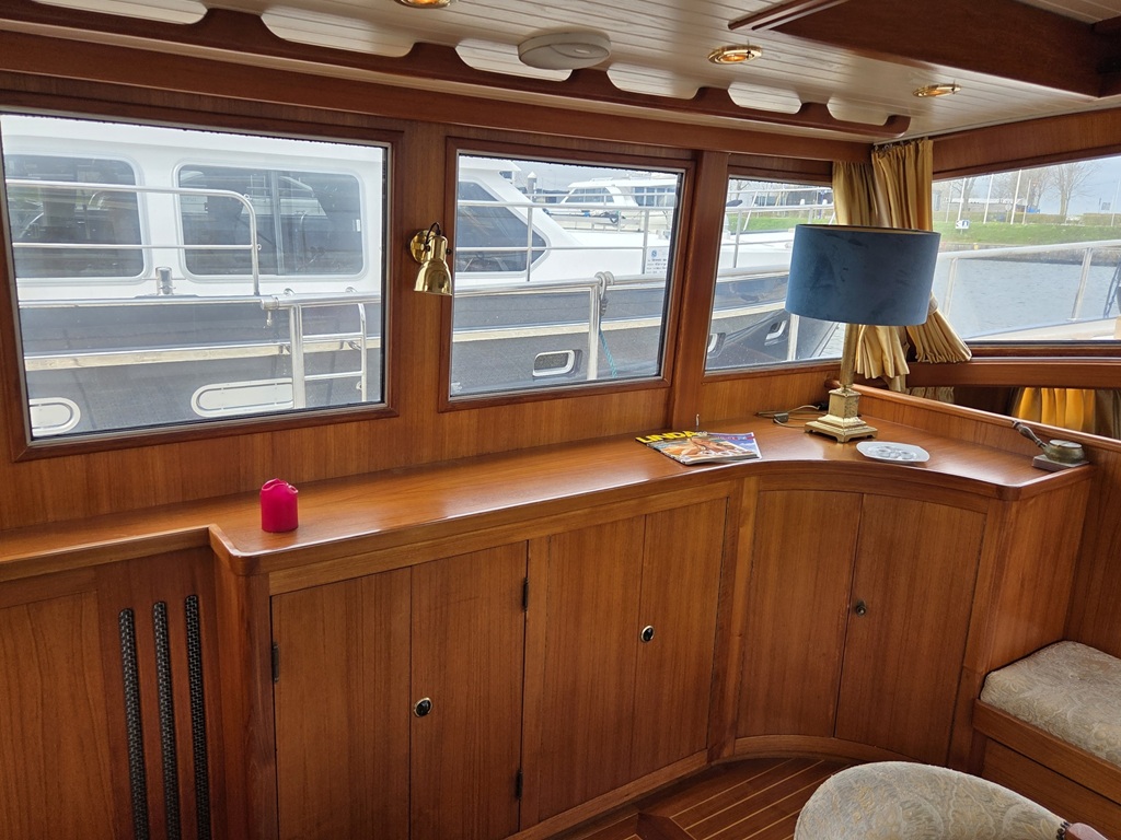 O.a. uitgerust met centrale verwarming, dubbel glas, afst. bedienig voor boeg- en hekschroef, slingerruit etc.