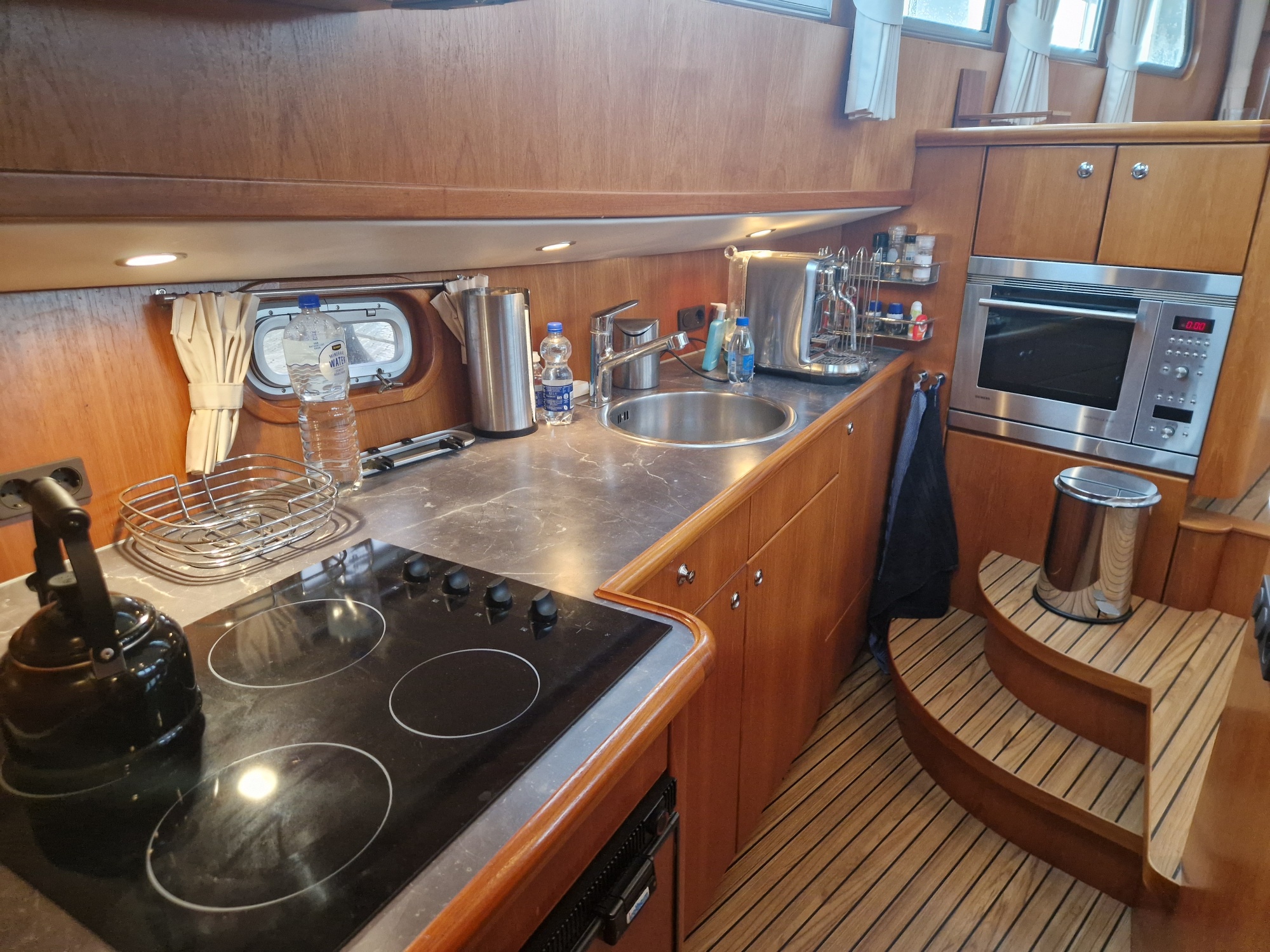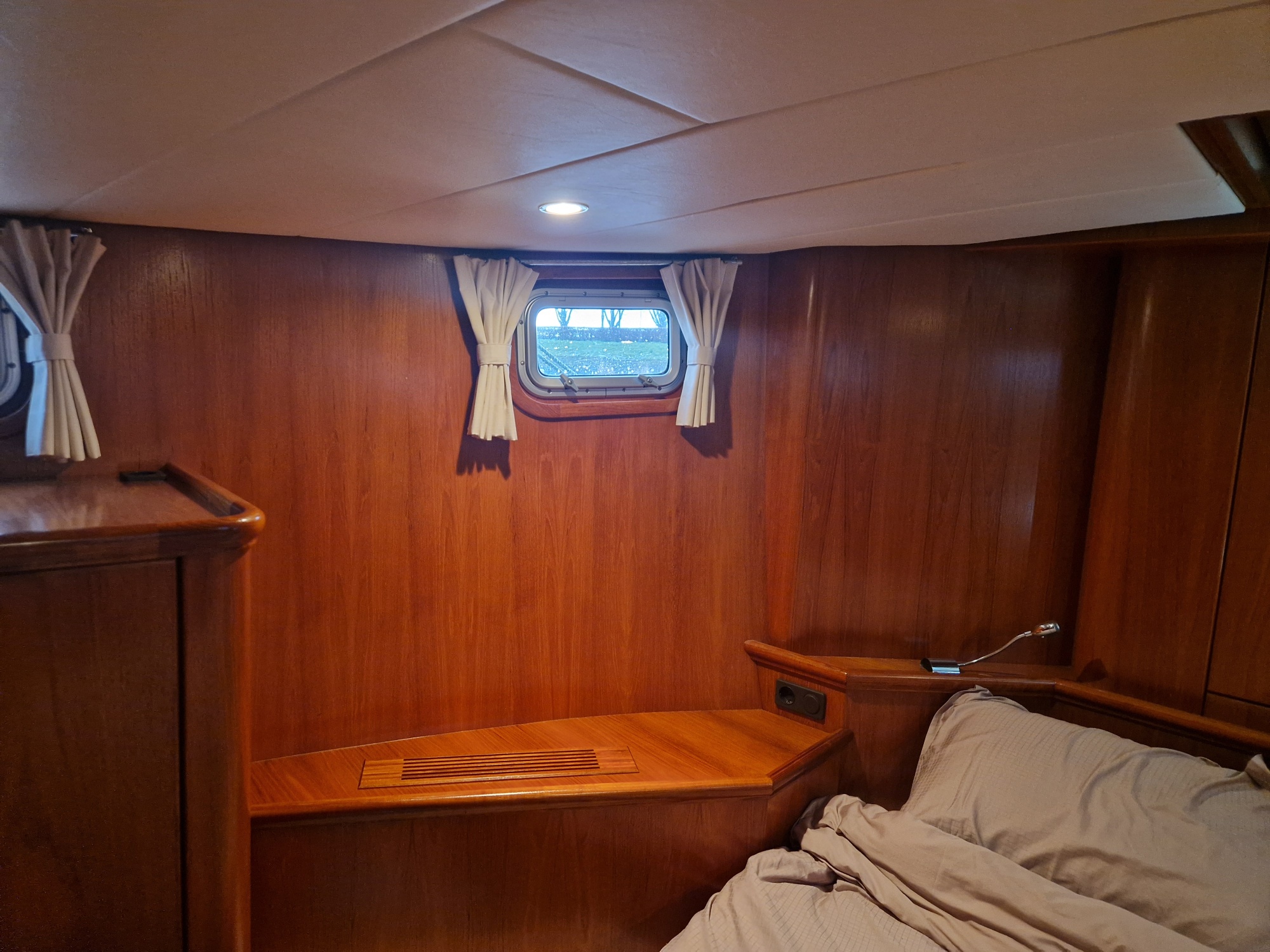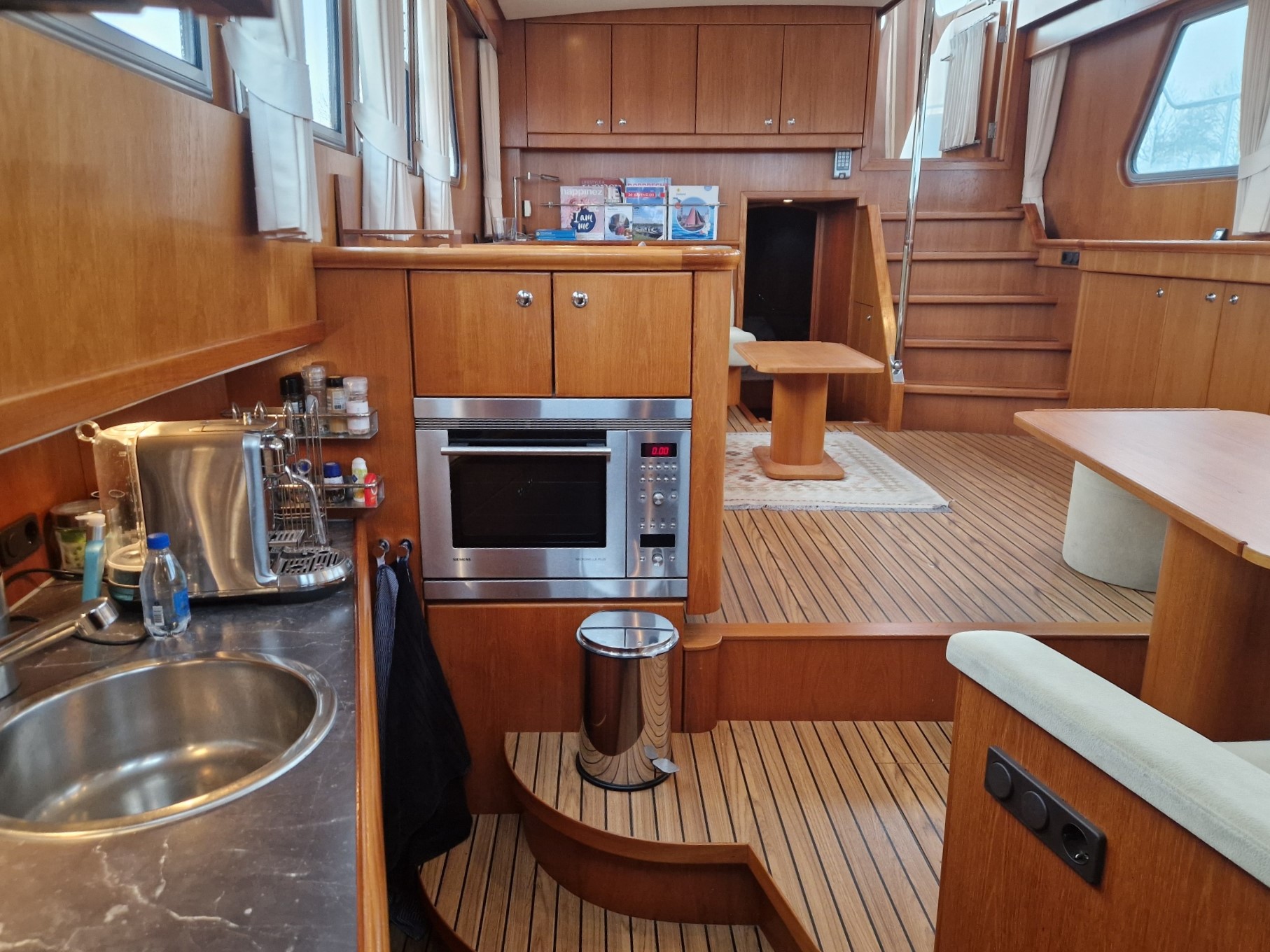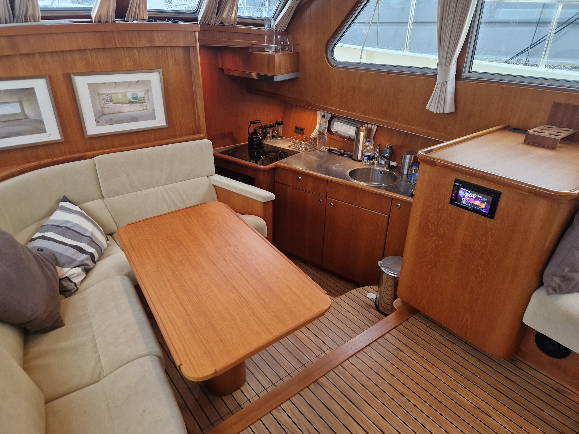 The interior is warm and practical, including a cosy saloon, a fully equipped kitchen with Corian worktop, combination microwave and fridge, and two spacious cabins, each with its own toilet. The owner's cabin has a French bed and en suite bathroom with separate shower. Thanks to features such as central Kabola heating, double glazing and mosquito nets for all windows and portholes, this boat is suitable for comfortable stays in any season.